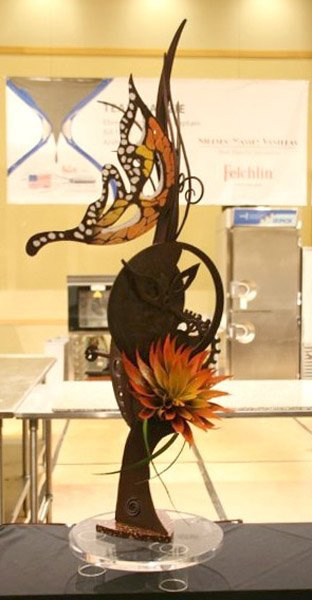 In keeping with the competition's "time" theme, the Chocolate Showpiece is comprised of intricate sets of gears, similar to the workings of an old clock. The monarch butterfly and zinnia flower are airbrushed in beautiful gradients of bright colors, which contrast and complement the chocolate structure.